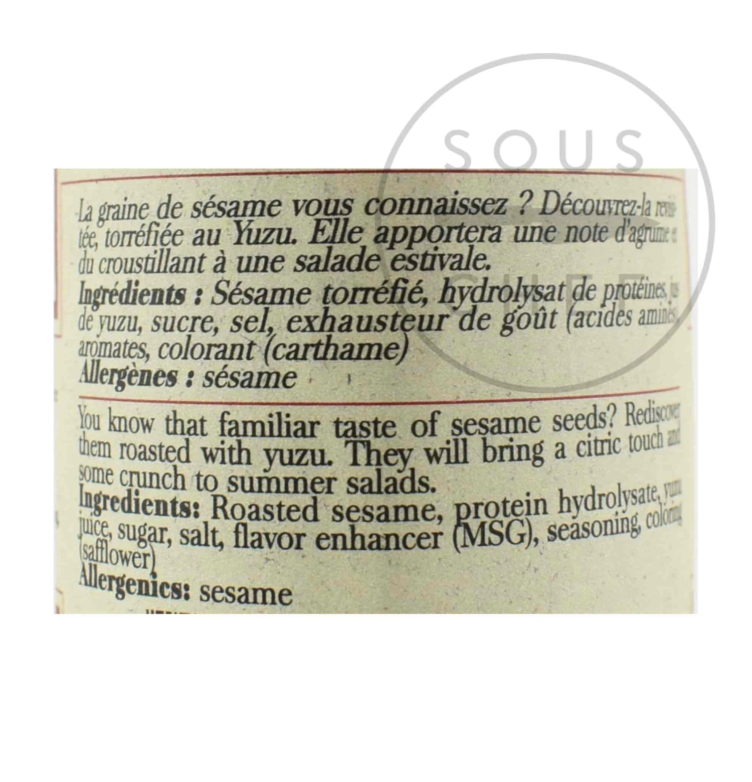 Ingredients: roasted sesame, protein hydrolysate, yuzu juice, sugar, salt, flavour enhancer (MSG), seasoning, colouring (safflower).