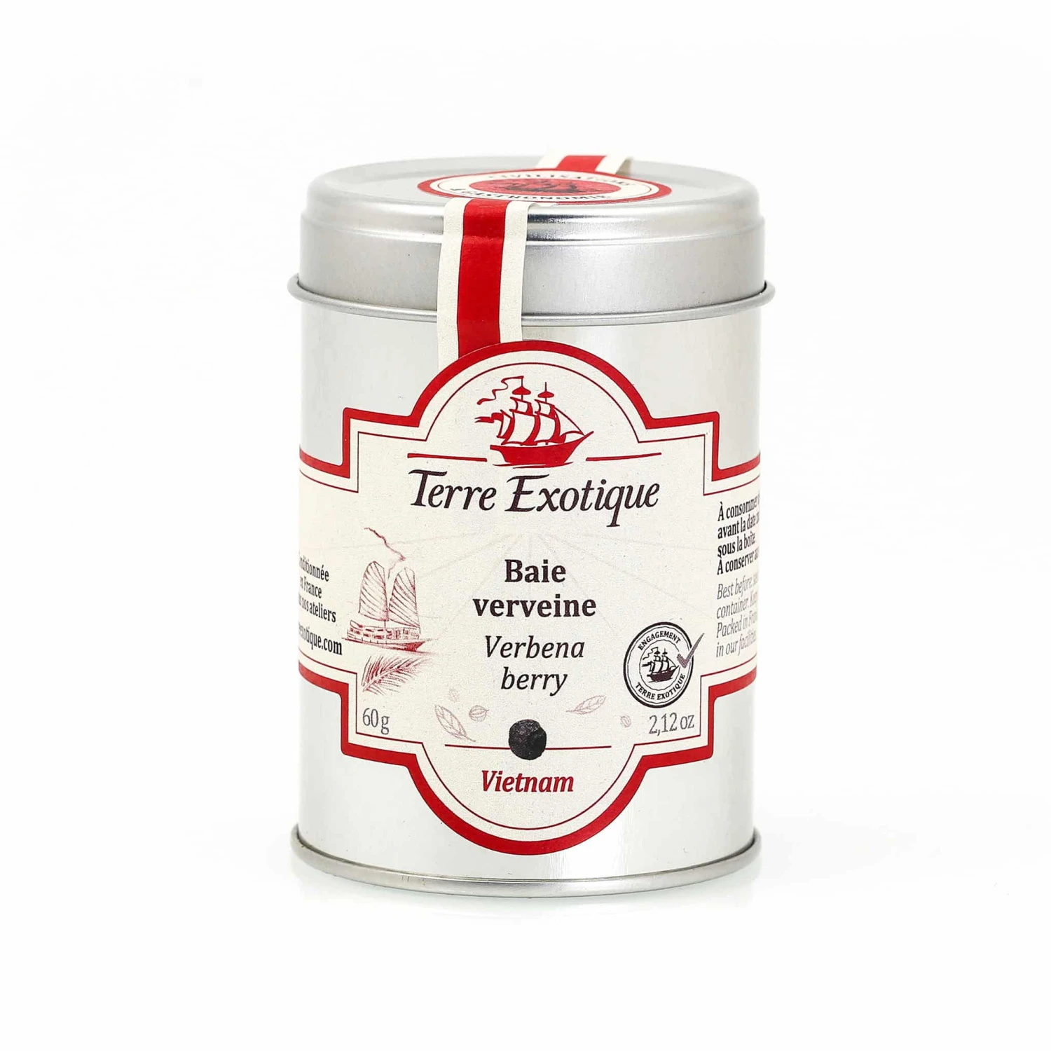 Terre Exotique’s verbena berry is a Vietnamese seed with a heady, floral flavour. Use them to add aroma and lemon flavour to fish and seafood dishes. Or sprinkle it into stir-fried vegetables. They also work well in sweet recipes, such as fruit compotes and even to flavour thick custards.