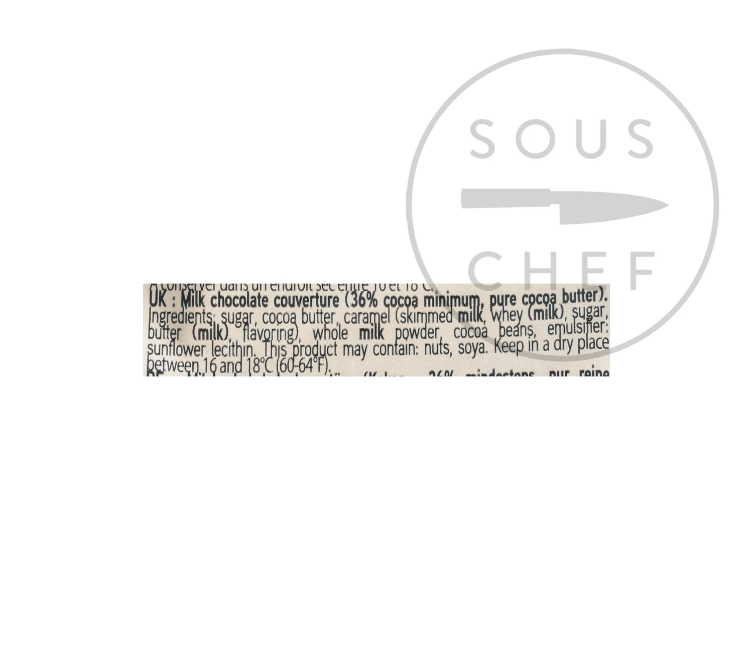 Ingredients: Sugar, cocoa butter, caramel (skimmed milk, whey (milk), sugar, butter (milk), flavouring), whole milk powder, cocoa beans, emulsifier: sunflower lecithin.Â